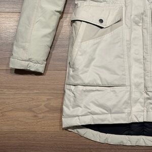Kuhl ÜKON Down Parka in Ivory, an off white cream color. Size XS. Excellent preowned condition, looks like it was gently worn but there are a couple spots on the Ivory exterior. Down by the bottom hem and under the left pocket there are some subtle grey marks, and near the top zip there’s a couple makeup marks that are also very subtle. Other than that this jacket is beautiful, really well made premium jacket from Kuhl. Down fill insulation. Awesome winter jacket! Pit to pit measures 18” and Length 34”.