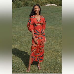 100 % Linen Anthropologie NWT Cala de la Cruz Gaia Linen Maxi Dress made in Colombia size L. PTP - 19”. Stretched to 20”. Under the bust - 16”. Waist - 16”, stretched to 17”. Hips - 20”, stretched to 21”.