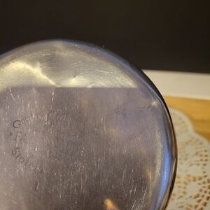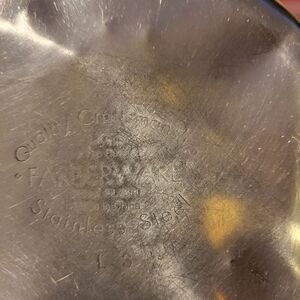 Overall in very good pre-owned condition. There are a few dents on the bottom but that does not impact overall use or ability to sit flat on a stovetop.