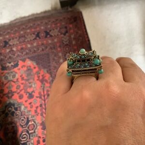 A unique and multi dimensional ring that features a 2 story gold tone Pagoda embellished with turquoise dangling beads and Swarovski crystals in amethyst and turquoise
