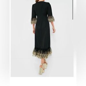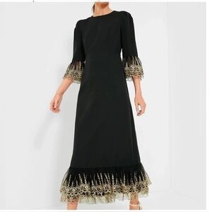 This showstopping black maxi dress features luxe gold embroidered lace at the sleeves and hem, flattering princess seams, a round neckline, and subtle puffed shoulders for a vintage-inspired silhouette. Perfect for weddings, holiday parties, or any formal affair. Hidden zip closure in back. Elegant column fit.
