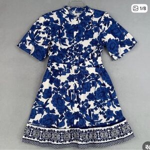 Joie Blue and White Floral Puff sleeve belted Dress (missing 1 Botton)