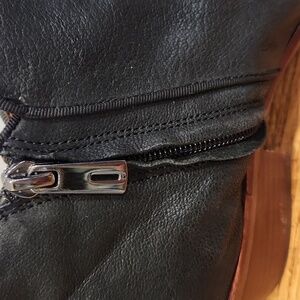 Sam Edelman Black Chelsea Style heel zip up leather bootie women's size 7.5. GUC. Exteriors are excellent with exception of a few scuffs on heels. Insoles also excellent. Interior back of shoes does show a little peeling. I cannot find a size. I can get these on my size 8 feet but they are snug. Estimate size 7.5. See measurements.