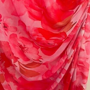 Elegant sleeveless maxi dress with vibrant floral pattern. Features shades of pink and red.