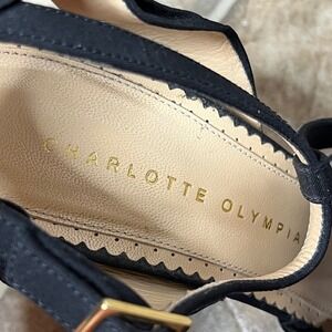 Charlotte Olympia Size 38 Black Satin Bow Block Heel Sandal T Strap Gold Glitter