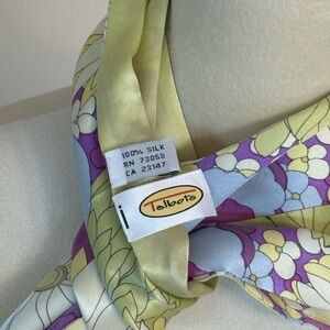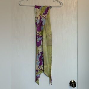 Chic floral silk scarf by Talbots will be a staple on your spring and summer wardrobes. Features vibrant purple and green hues on one side, and solid spring green on the other. High quality item. Perfect for adding elegance to any look.