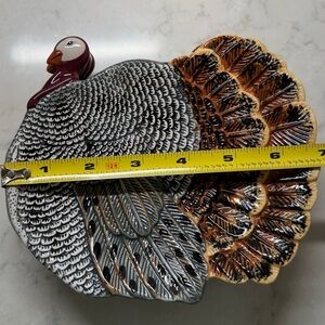 Enhance your holiday table with this set of vintage decorative turkey plates. Featuring intricate designs in black, brown, and cream, these plates add a festive touch to any gathering. From 2005. Please see photos for measurements.