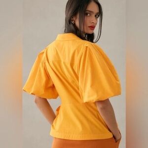 Anthropologie Longline Wrap Blouse Orange Yellow with Puff Sleeves