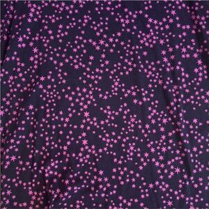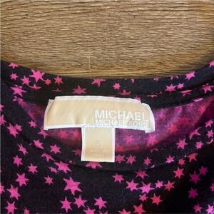 Michael Michael Kors black long sleeve top with vibrant pink star print throughout. Features cold shoulder cutouts and a flattering fitted silhouette. Soft, lightweight fabric with stretch, ideal for layering or wearing on its own.