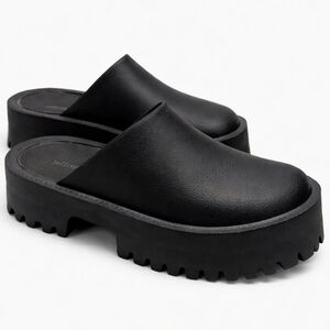 Jeffrey Campbell black platform clogs with chunky lug sole.