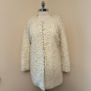 Pretty amazing Italian designer white coat that looks like a sheep's fleece. It is like a large scale boucle. White quilted lining. Has 3 silver metal hook closures down front. Great piece!