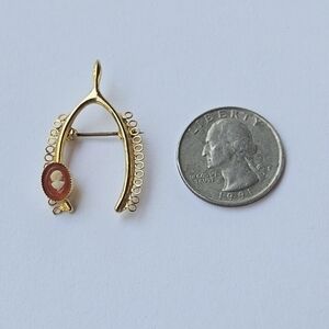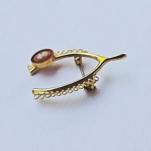 Vintage cameo brooch, miniature cameo on a gold tone fiber wishbone.