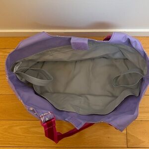Charming purple bag with star patterns. Features pink handles. Ideal for travel.
