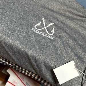 Mens gray t-shirt with a graphic design of fish and hooks to form the flag on the back. Front has 2 hooks over left chest and Ocean & Coast. A southern tradition in chest. New with tags. Chest measures 25 inches pit to pit. Length measures 28 inches long.