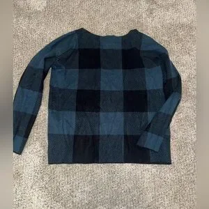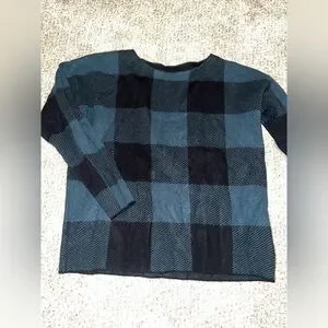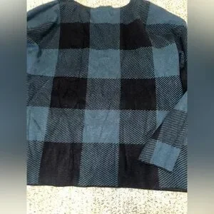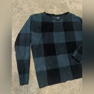 Jones New York Women's Black and Teal Blue Plaid Crewneck Sweater