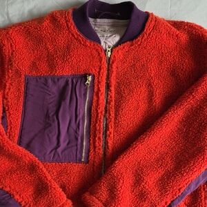 Oversized vibrant red jacket with purple accents. Warm and stylish.