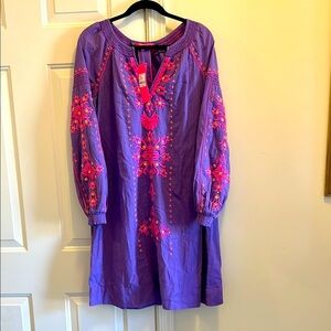 Elegant purple dress with vibrant pink embroidery, perfect for any occasion. Boho Vibes Smocking on neck and cuffs . The detail is stunning on this dress . Does come with a belt to change the look up 100 percent cotton 38 long Pit to Pit 21