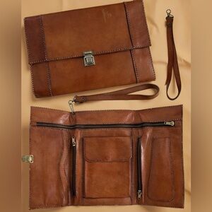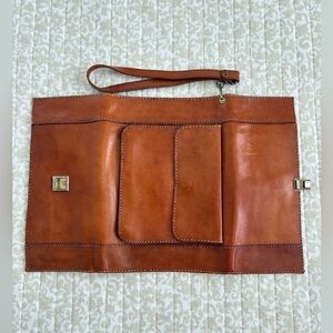 This vintage 100% genuine vegetable- tanned leather clutch features rich cognac brown patina, multiple zippered compartments, and a detachable wrist strap - perfect as an everyday wallet, travel organizer, or minimalist clutch for nights out.