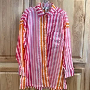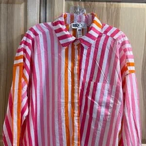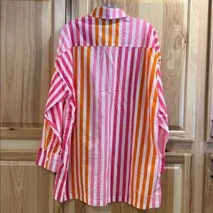 Bold striped shirt cover up with pink and orange colors by Beach Riot. Features a classic collar and button-up design. 100% cotton. Resortwear, vacation, oversized, beach, pool, loungewear. Excellent condition.