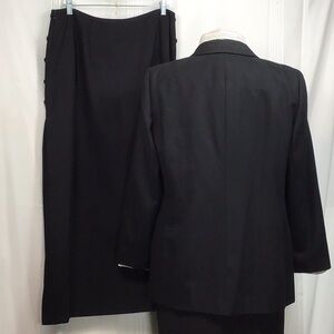 Harve Benard by Bernard Holtzman Black lightweight wool tailored suit, jacket is fully lined, single breasted button front, front side pockets, feminine bust darts and shoulder pads.