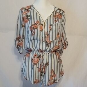 Elegant blouse with floral and striped pattern.