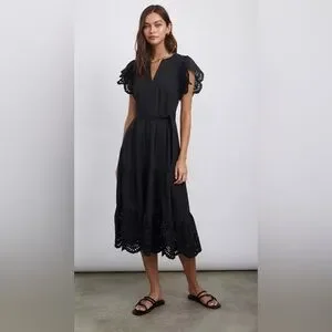 The Rails Gia dress in black is a timeless black dress with the extra benefit of exquisite eyelet embroidery, making it the ideal outfit for casual lunches and date-night meals. Featuring a gorgeous tiered skirt and tie fabric belt to enhance your shape.
