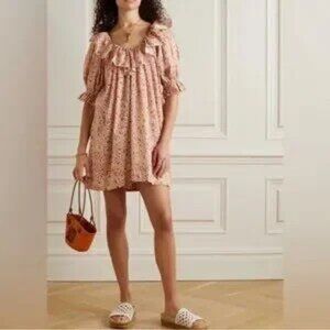 DÔEN Liberty Fabric Chime Floral Mini Dress Size M in Coral Poppy Boho Ruffles
