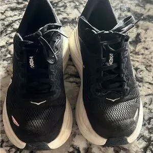 Hoka Bondi 9 sneakers in black and white. Sleek design with cushioned sole.