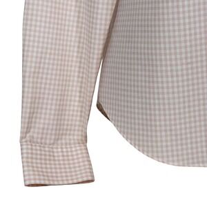 Lauren Ralph Lauren button down shirt in a charming peach and white gingham pattern. This classic top features a pointed collar, button front closure, and a single chest pocket. The 'Non Iron' fabric ensures easy care and a polished look. Perfectly suited for casual outings, office wear, or weekend brunches.