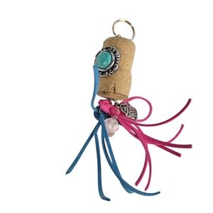 Stylish cork keychain featuring a turquoise accent and vibrant tassels. Perfect for adding a pop of color to your accessories.