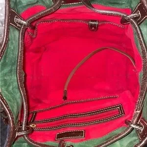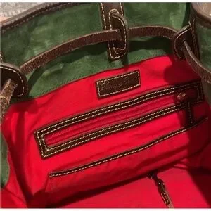 The Dooney & Bourke Florentine Nubuck Leather Buckley Bag is a large, luxurious bucket bag perfect for travel, casual outings, or business meetings. Made from high-quality leather with a distressed finish, this satchel/top whip switch handle bag features double brown leather handles, gold-plated hardware, and a red leather lining. The navy exterior color adds a sophisticated touch to the overall design, making it a stylish accessory for any woman's wardrobe. The included key holder adds a practical element to this elegant and versatile bag.