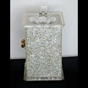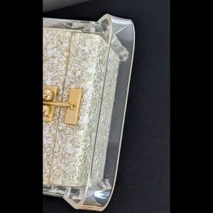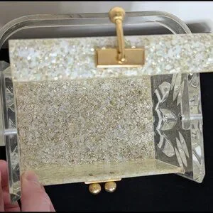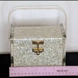 Fascinating CHARLES KAHN Confetti and Clear Lucite Box Purse with clear Lucite Handle, dating from the early 1950s. Purse is in fabulous condition especially for being nearly 75 years old, it is in Very Good-to-Excellent Condition with NO Warps and NO Cracks! There is minor bubbling on the Lucite Handle as shown n picture 10, and the "Charles Kahn" label fell off (it was only a clear sticker to begin with, from the factory). But the Side Designs of the Purse and unique Confetti design indicate a genuine CHARLES KAHN.