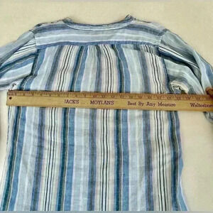 This fine linen tunic/dress by Pinecone Hill is in good use condition. Measurements in pictures shades of blue off white gray stripes button down the front and buttons at the sleeve.