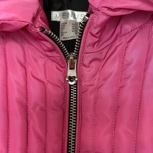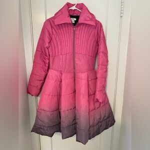 New without tags, never worn. Chic pink to purple ombré puffer jacket with quilted design and defined waistline. Features a stylish zip front. See photos for fabric composition and garment measurements.