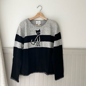 Vintage Christopher & Banks Medium Black Gray Cat Embroidered Knit Sweater