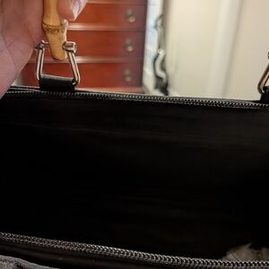 This elegant black handbag features charming ladybug embroidery and a unique bamboo handle, perfect for adding a playful touch to any outfit.