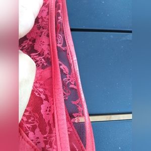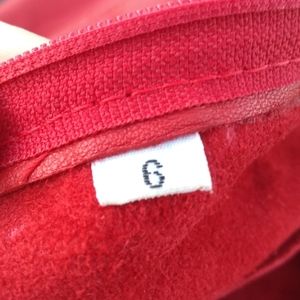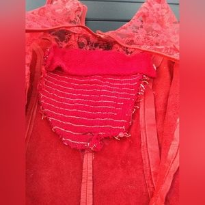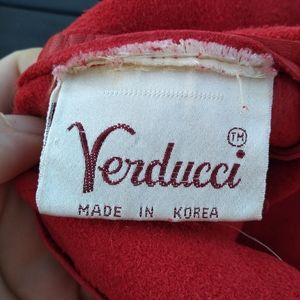 I'm not sure whether this is 1980s or 1990s fashion. Bodycon-style vintage Verducci red leather dress with lace accents. Size 6. Sleeveless. Lace bustle / short train on the back hem. Some one has placed a red sequined scrap of material on the inside of the plunging front lace neckline for modesty (see photos) but it could easily be removed. Shows wear on the arms (see photos) and there is some fade in the lace on the left shoulder (see photos). Needs some leather conditioning. Quite the dress and sure to turn heads.