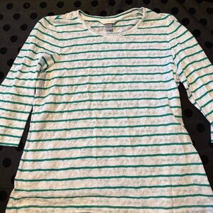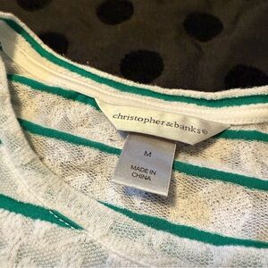 Christopher & Banks Green & White Striped Shirt - - size medium M white sort of lacy material with bright green stripes. 3/4 sleeves a good bit of stretch. Perfect for St Patrick’s Day show your Irish love - would look very cute under a yellow cardigan as a Green Bay Fan! I’d wear with a red scarf and make it Christmas y. ! Excellent condition.