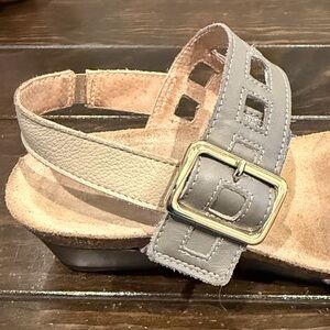 Step out in style with these chic black & grey NAOT sandals Size 40. These are versatile and work for many occasions. Has a Velcro closure on the buckle so very easy to put on or takeoff. Also has a backstrap to give you more secure support . Travel hardy sandals! Wear with dresses, pants and skirts. Whether you are walking on cobblestones in Europe or heading to a beach party. Extremely comfortable, sandals are made in Israel & original price was $170.