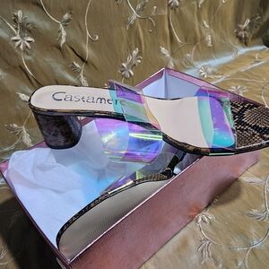 Elevate your look with these stunning iridescent mules. Featuring a chic block heel and a shimmering design, they're perfect for any stylish occasion.
