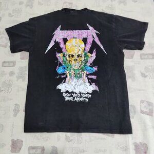 ThiThis is a REPRESENT England tee, size M. It’s a black washed short-sleeve top. The front has two distinct graphic designs: one features a skull with the "Metallica" logo and the phrase "Soon You’ll Please Their Appetite", the other shows a statue motif with "Metallica" and "...AND REPRESENT FOR ALL" text.
