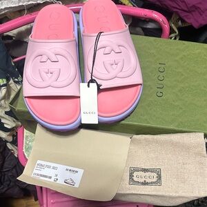 Chic pink slides with embossed Gucci logo. Comfortable purple sole. Ideal for everyday style. Never worn in original packaging
