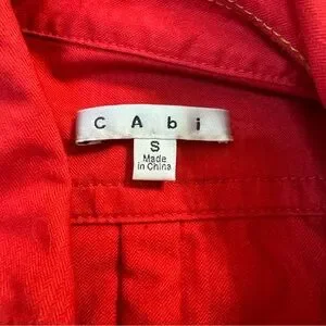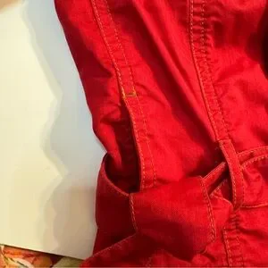 Chic red utility jacket with belt. Features contrast stitching, zip pocket, 2 side pockets, button detail on sleeves and classic collar. Perfect for versatile style. Tiny dark dot on left sleeve and very slightly lighter area next to front zip pocket. I don’t think either one is noticeable unless you get very close. Otherwise in very good condition.