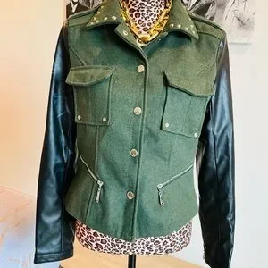 I AM YOUR LEADER! Military style, silver spiked jacket with pleather sleeves and a green army felt bodice silver snap buttons, zippers and studded spikes on collar and shoulders. Slightly cropped measurements laying flat are 18 inches across 19 inch length 23 inch sleeves by JouJou with green silk lining. Tagged women’s size medium, but is form fitting fits snug.