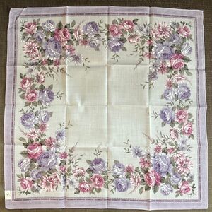 Gorgeous vintage Mario Valentino headscarf / neckerchief with lavender & pink floral design. New in original packaging. I believe this is 100% silk. The label is in Japanese. Measures 17”.