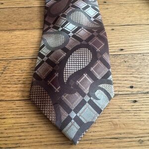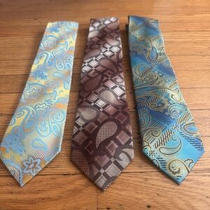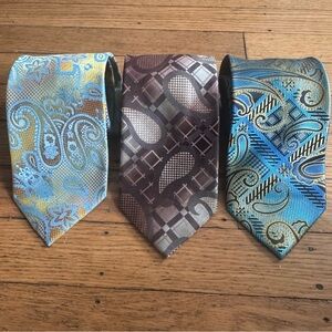 Stylish ties with paisley and geometric designs. Perfect for formal events. Enhance your look with these vibrant accessories. Great condition.