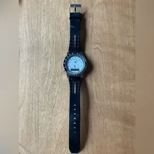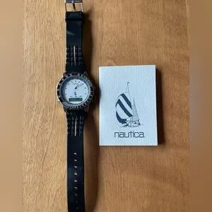 Elegant Nautica watch with a black band and white face. Watch features a black and silver bezel with black leather band (band is not original Nautica band). This quartz movement watch has a water resistance of 50m and provides various functions such as LCD display, month and date indicator, chronograph, and alarm. Case size is 40mm. Some scratching on back of watch as indicated in picture. New battery.