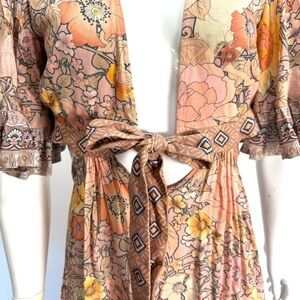 Step into elegance with the Spell and the Gypsy sundress, featuring a soft pink and cream palette perfect for wedding guest attire. This high low dress boasts a plunge neckline and flutter sleeves, offering a romantic and airy feel. Ideal for cocktail events, its flowing design and intricate details make it a standout choice.