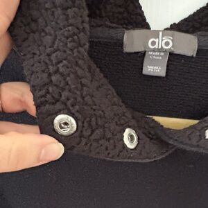 Chic dark jacket by ALO Yoga. Features a textured design and two snaps at neck for an optional “mock neck” look.