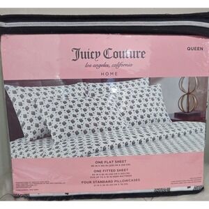 Keywords: Juicy Couture Home, Queen bedding, Leopard print, Heart pattern, Crown detail, Los Angeles, Fashion bedding, Designer sheets, Luxury sleep, Glamorous decor, Playful design, Cozy comfort, Pillowcases included, Pajama chic